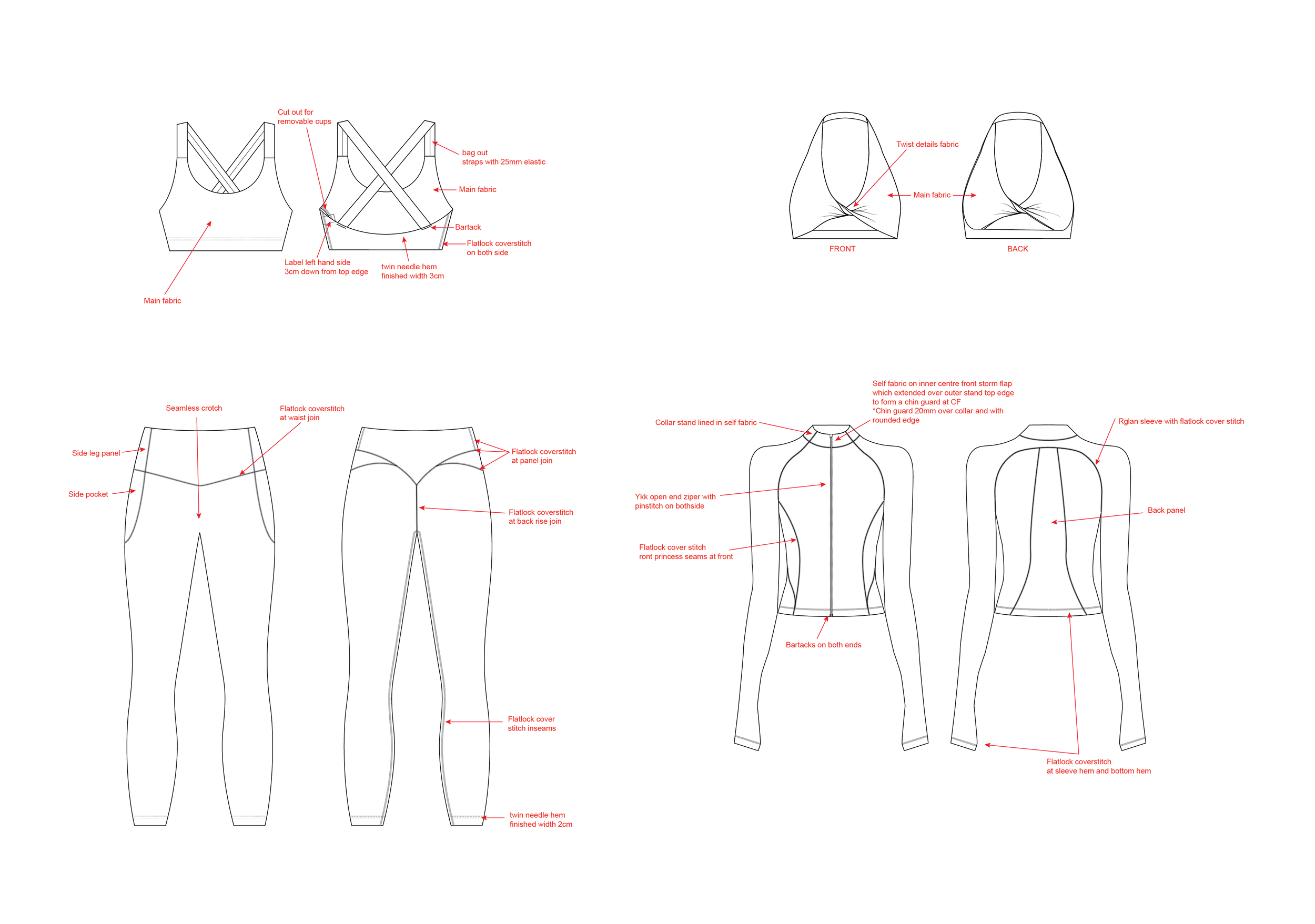 Womenswear activewear collections from concept to technical execution, including CAD arrays, illustrated outfits, and production-ready construction specifications.